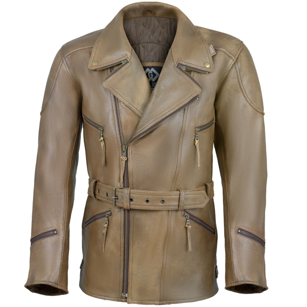 Pánský kožený 3/4 kabát Vintage Tan křivák s kapsami na chrániče
